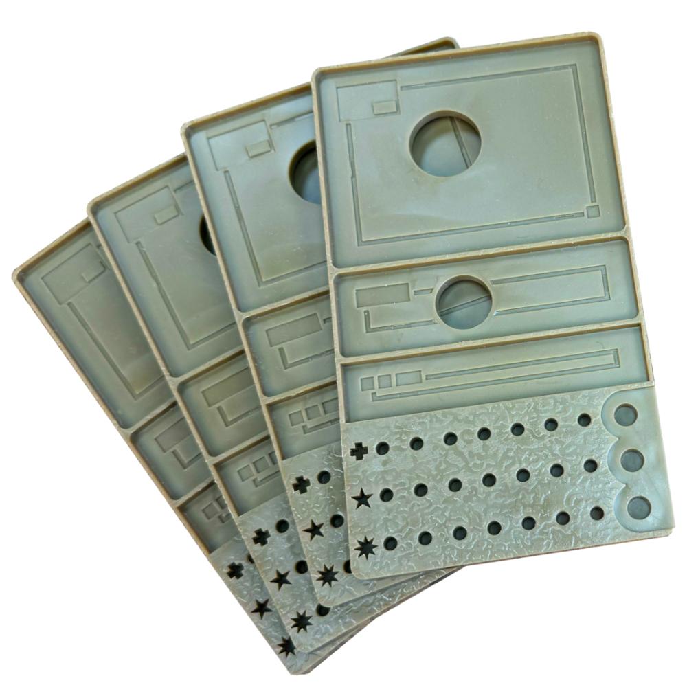 This booster pack for Maladum contains enough plastic dashboards and coloured pegs for a full Adventurer Party. They are identical to the ones in the starter set and are vital for multi-player games with multiple parties–one set is required for each additional party.