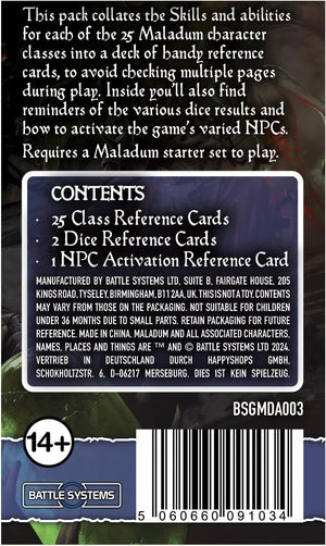 This pack collates the Skills and abilities for each of the 25 Maladum character classes into a deck of handy reference cards, to avoid checking multiple pages during play.