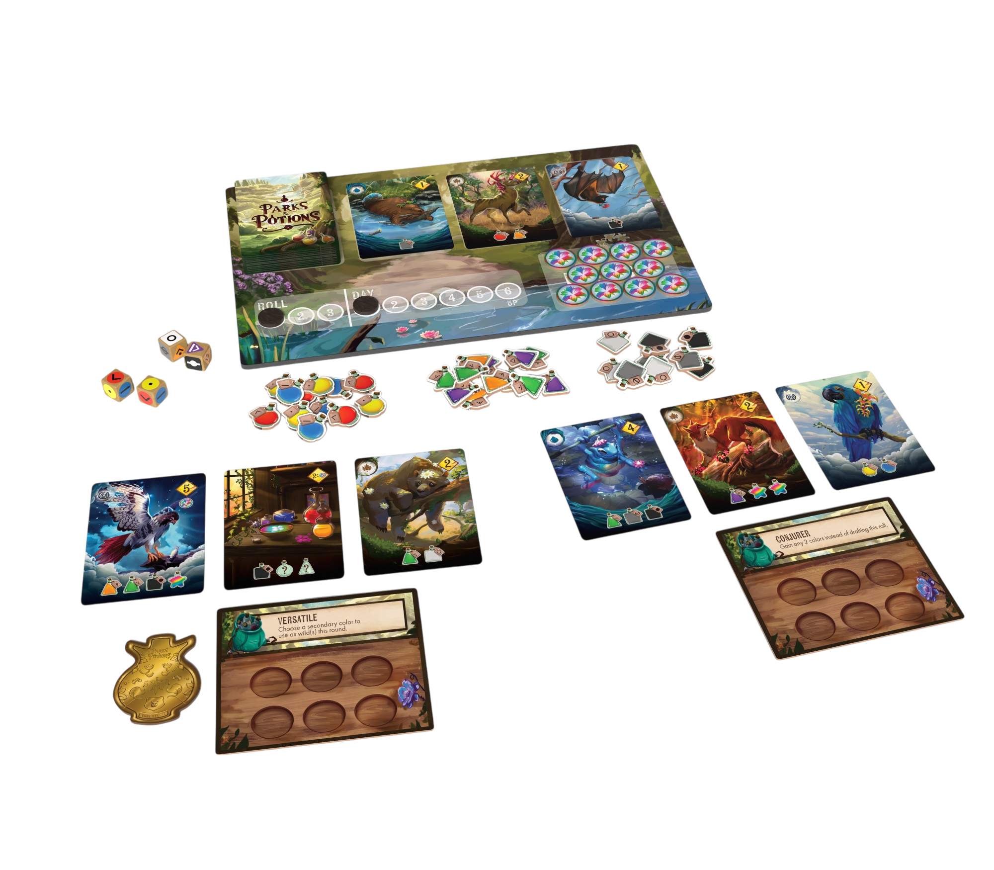 Parks & Potions plays over 5-6 rounds, each representing a day of work. The game is divided into phases in which players roll dice to discover flowers to extract, manage their inventories, and use potions to fulfill objectives and cure animals. Strategic potion mixing and objective completion are key to becoming the most renowned ranger.