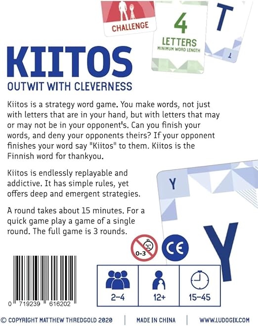 Can your word be finished for positive points, or can you trap your opponent into not being able to play and force them to pick up the unfinished word for negative points? Can you outwit your player with cleverness? If your opponent finishes your word for you say “Kiitos”, the Finnish word for thank-you.