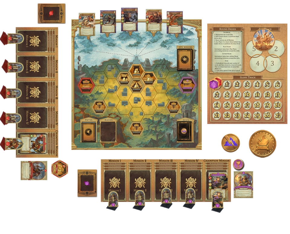 Kleos features tactical card-play and action management. Play powerful blessings and curses to gain advantage. Summon Minions onto the board or use them as upgrades, serving as mounts or offerings to bolster their allies.