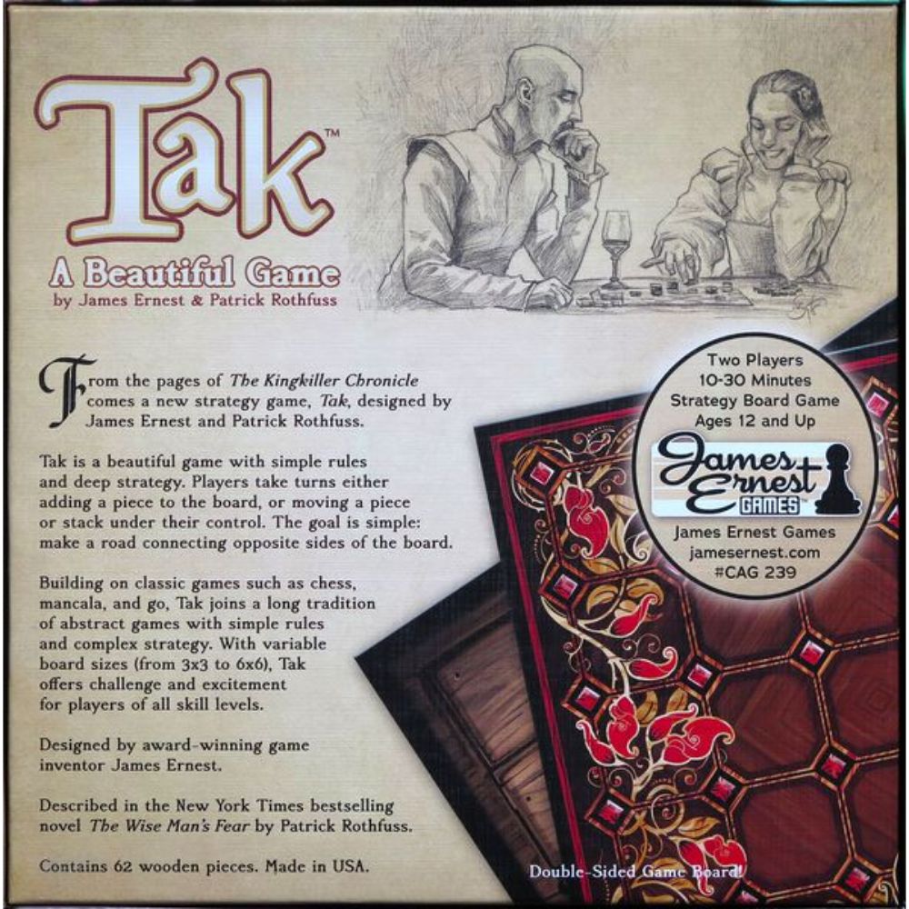 Patrick Rothfuss first introduced Tak in the second installment of the Kingkiller Chronicle, The Wise Man’s Fear. However, the rules were not introduced in the book, because at the time there were none! Ernest and Rothfuss have brought Tak to life in an elegant two-player abstract strategy game reminiscent of classics like Go and mancala.