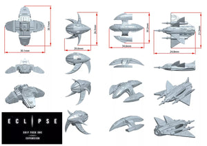 Eclipse: Ship Pack One includes six unique sets of plastic ship models—Interceptors, Cruisers, Dreadnoughts and Starbases—for the alien species in the Eclipse base game, a Terran/Magellan player board, and some other new components.