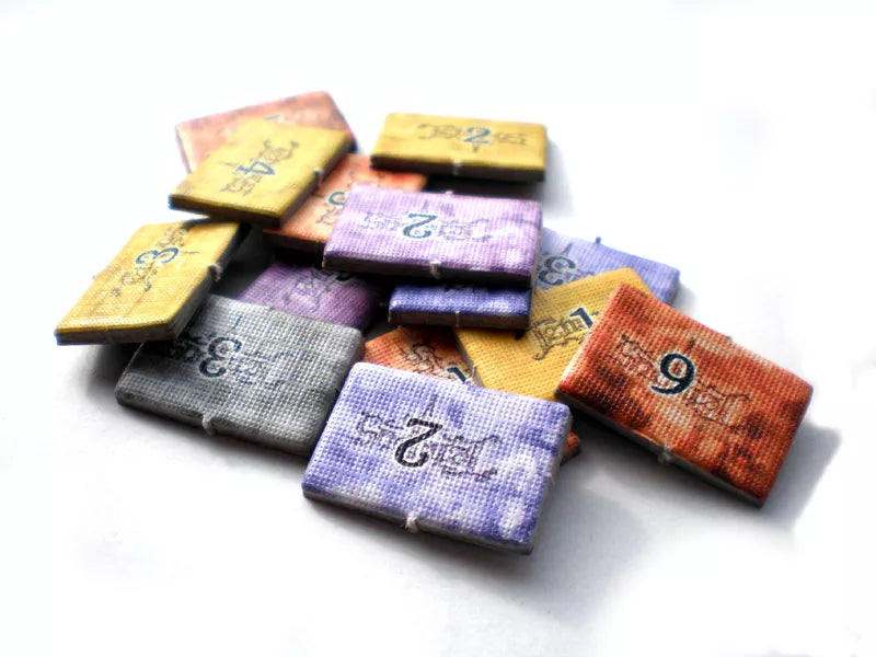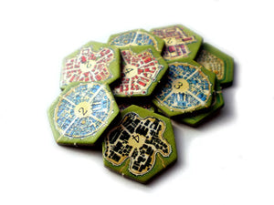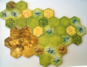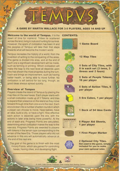 The game contains twelve map tiles. Each map tile is made of one hexagon surrounded by six hexagons. Each tile will have a mixture of any or all of five types of terrain: grasslands, farmlands, mountains, woods, and hills. Each player gets a Player Aid card, selects a color of people tokens and places the era cube of the matching color on The Era Starting Box on the Progress Column part of the game board. A starting player is selected. Some tiles are placed contiguously on the game board (the number of tiles depends on the number of players) one at a time in turn order. Each player, in turn, places three of their people tokens on the game board contiguously. The game is now ready to begin.