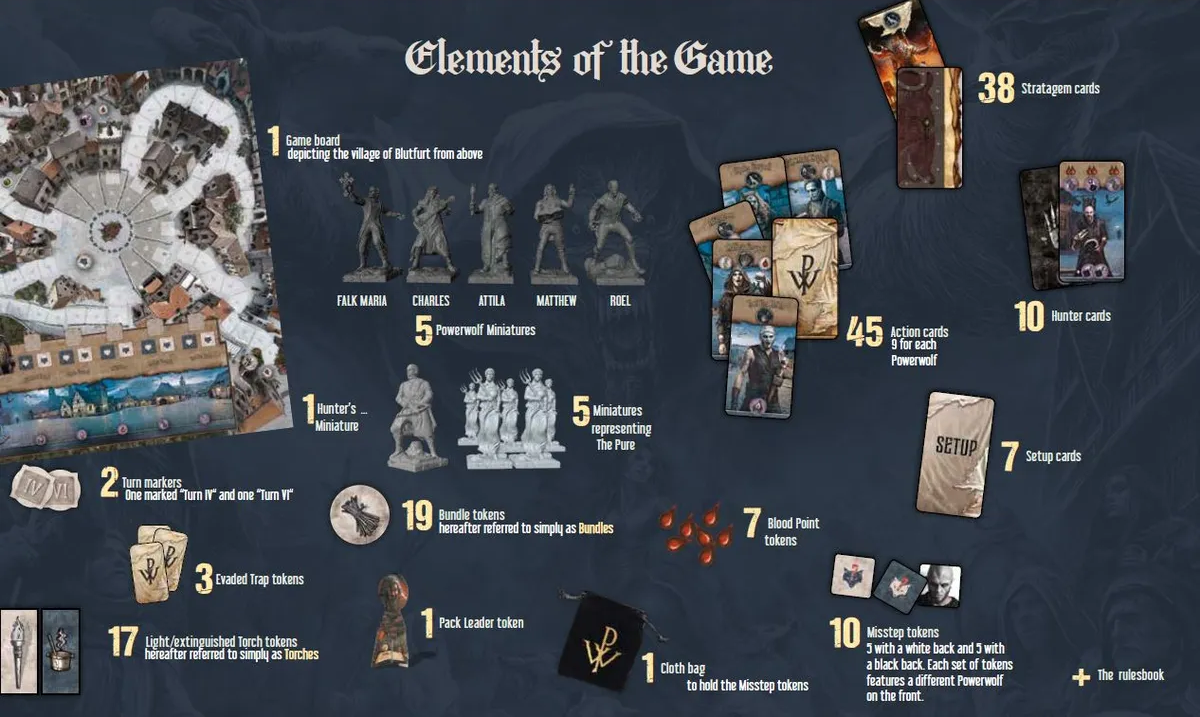 1589 is a co-operative game in which players must lead the Powerwolf in a desperate quest to save an innocent girl from a false accusation and a terrible fate before the hour of Vespers (that is, within eight game turns). They will gather evidence of the Prior's fanaticism, act from the shadows to sabotage the execution — by extinguishing torches or stealing bundles — lure the witch hunter away from the pyre by drawing him into the forest, and sway the Pure to return to their homes, convincing them of the girl's innocence.