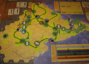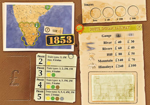 This is the Indian sub-continent (British Imperial India) member of the 18xx family of games. It is billed as A game for engineers who've had enough of the financiers! It involves five-foot-six and metre gauges, hills, mountains and the Himalayas, contract bids and government mails. The technical challenges of building a railroad network in difficult country stand on a par with the financial market manipulation which usually dominates the 18xx games.