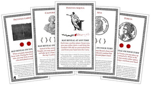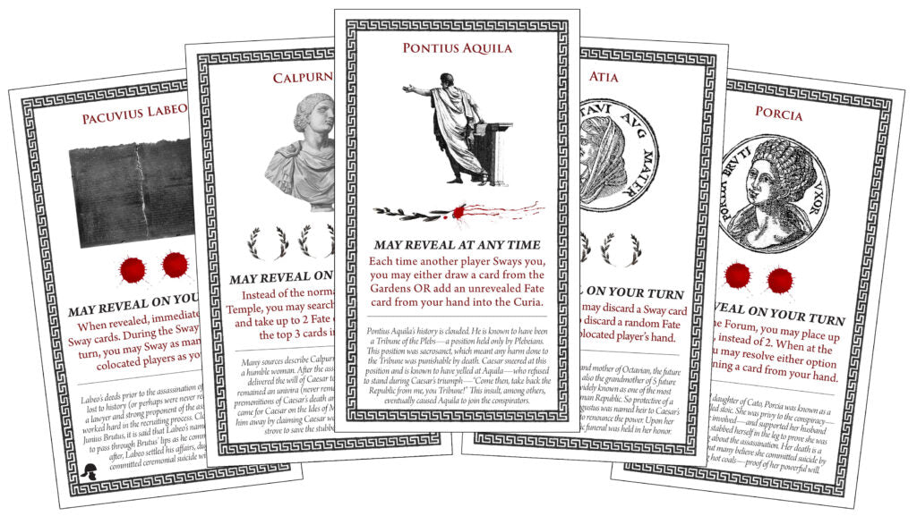 Throughout the game, you travel through Rome, manipulating other citizens and swaying them to your cause. At the end of the game, if 23 or more knives are in the Curia, Caesar is dead and the liberator most committed to killing Caesar wins. With fewer than 23 knives, the loyalist most dedicated to saving Caesar wins. Opportunists are those who linger, waiting to shift the fate of Caesar at the last moment, and if they do, they win as a team.