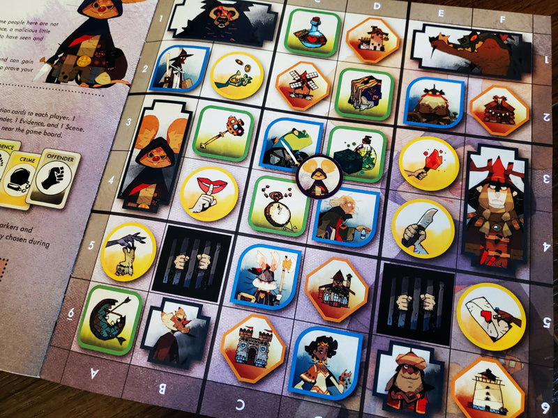 Each scenario come as a 6x6 grid, in which you can find different types of colored boxes. Each box's color corresponds to a type of proof, and at the beginning of the game, each player will draw a card for each type of proof on the grid. This combination of cards is your neighbour's solution, so each player will be responsible for the solution of another player. Turn after turn, each player asks select questions that will help not only them, but everyone else playing as well. The goal is to find out your solution before you run out of questions, as you only have a limited number of questions to ask before the scenario ends!