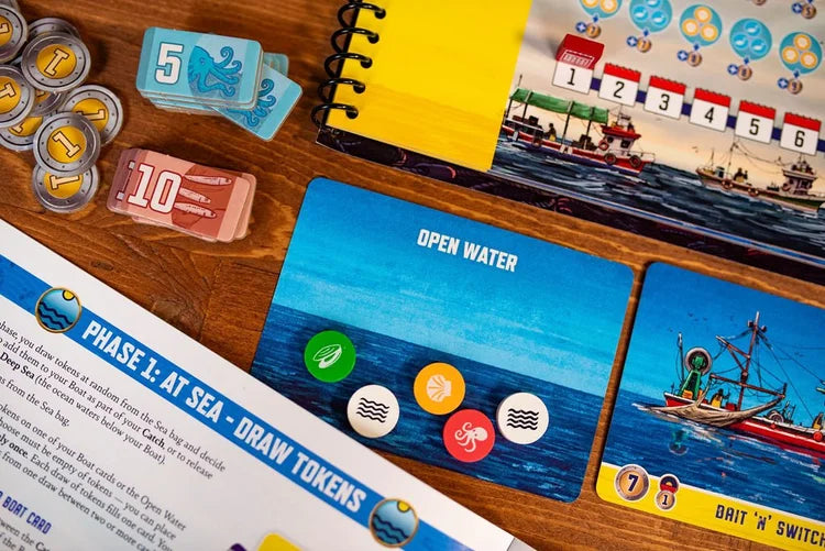 In each game of Conservas, you begin each season with a single boat and a little money. The sea is represented by a bag of chits full of fish and water tiles. In each round, you will fish from this bag, taking some back to your facility for tinning while leaving others at sea to breed.