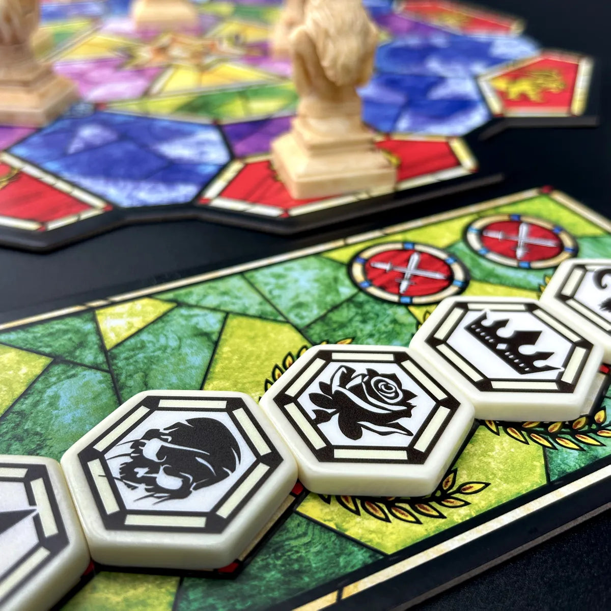 But the magic of the game is which pieces can be activated each turn - and what they are capable of, based on their position on the tile track. Hex Tiles on the bottom three positions are locked and cannot be moved. The top five can move by placing the tile on the bottom of the Hex tiles and pushing all tiles above it up one notch. Tiles in the top two spaces are the only ones capable of capturing and eliminating a piece. Tiles in the top three positions are the only once who can be moved to the Throne space (so long as it is YOUR pawn). Manipulating and strategizing how to move and position these tiles to suit your agenda is critical. Keeping your identity secret, while unveiling your opponents is the tension.
