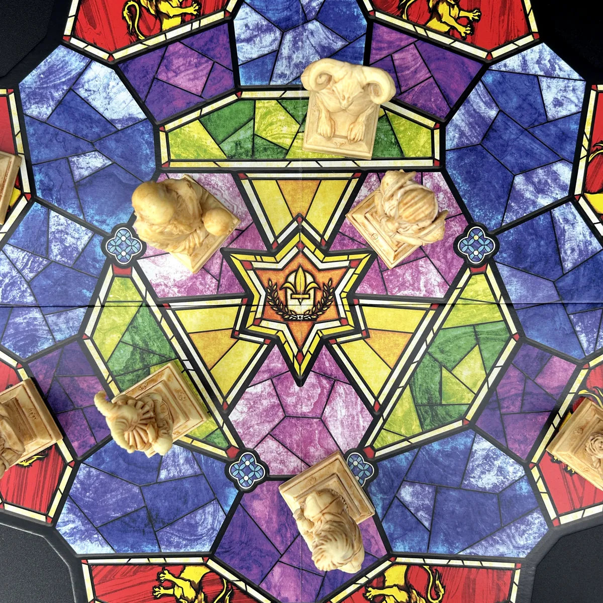 ENTHRONE is an abstract, two-player deduction game. The roughly octagonal, diecut board is ringed by 8 beautifully crafted figures, busts representing the potential heir to the throne; the reigning King, the Priestess, the Knight, the Jester, the Demon, the Assassin, the Archer and the Wizard.