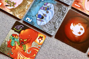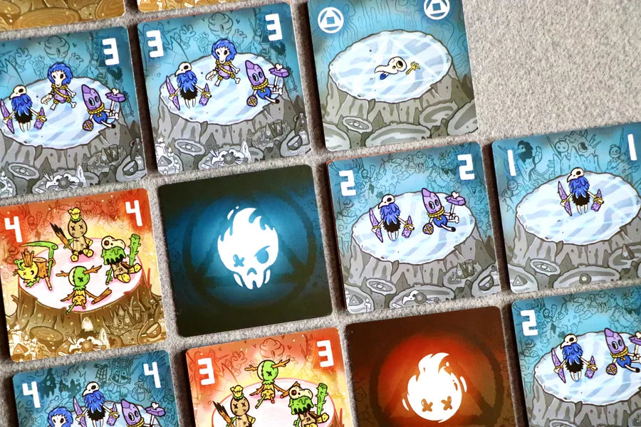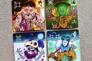 A two-player card game of dueling mages. Each player gets a symmetrical deck of cards with values from 1 to 4 which symbolize the troops of magic minions he has created. Players take turns laying down their chosen cards to form a line of 3 or 4 (depending on the mode of play). They must follow several rules when doing so:
