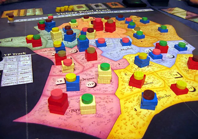 Normally the player with the most victory points will win. However, there are two sudden death game end conditions that may alter the outcome. The first is a radical electoral landslide, triggered by the red faction gaining 17 or more votes. The second is successful Royalist counter-revolution, precipitated by Royalist control of seven counter-revolutionary provinces. In both cases, victory is determined by a different set of criteria, in which accrued victory points do not count. The player who is ahead on points must be aware that one mistake could lead to defeat at the hands of the Jacobins or Royalists!