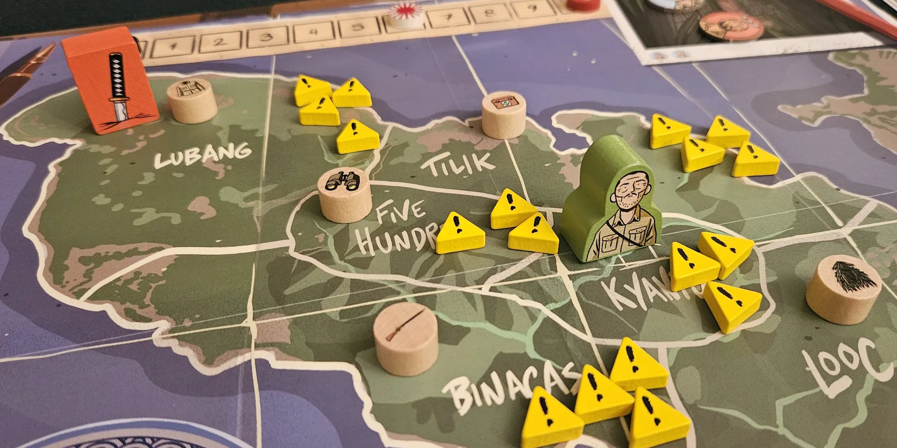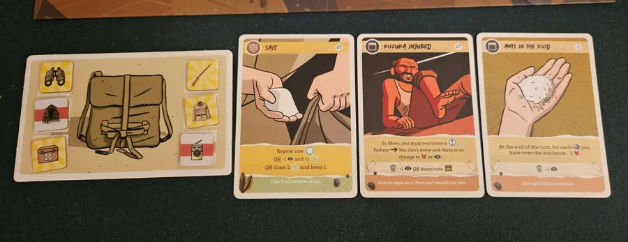 During six rounds of variable duration, you have to obtain a number of resources that will allow you to finish the turn without suffering penalties. In each round, you will also undertake a mission, earning honor points for it. During your adventures, you will experience some of the events that the real-life Onoda had during his stay in Lubang. If you manage to overcome the six rounds without going insane due to paranoia or dying due to ill health, it will be time to see whether you will be recognized a hero or fade into oblivion.