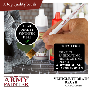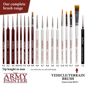 The Vehicle brush has a flat stiff end making it perfect for highligting edges on tanks and drybrushing anything from scenery to most vehicles. Also large monsters benefit from this brush where it is used as an enormous drybrush.
