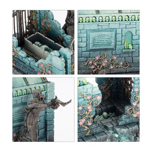 This multipart plastic kit builds three faction terrain pieces to make up a Cursed Sepulchre, a focus for the necromantic energy of your Soulblight Gravelords armies in games of Warhammer Age of Sigmar. These mournful structures offer benefits to your undead army, bolstering summoning spells, and healing itself whenever blood is spilt on its unhallowed ground.